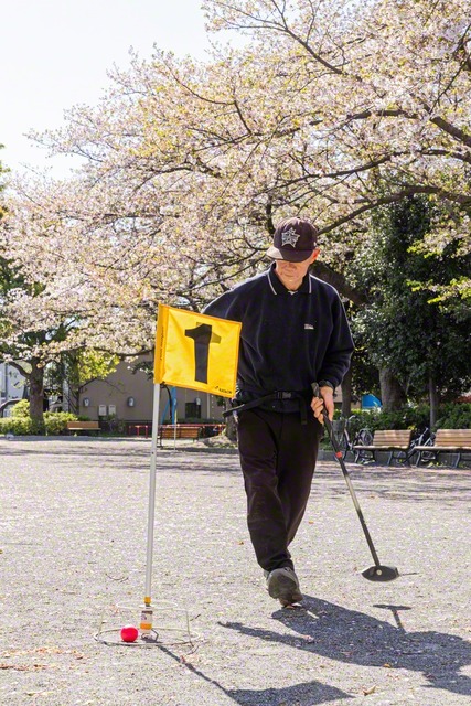 愛用のクラブを携え、自ら三輪自転車をこいで公園へ向かう。「ホールインワンを取るぞー!」。病の影響で体が揺れる。その揺れに合わせて打つ。「自分の意思とは関係なく体が動いたり、動かなかったりするんだよね」。そうした体で1日5000歩を超える日もある。