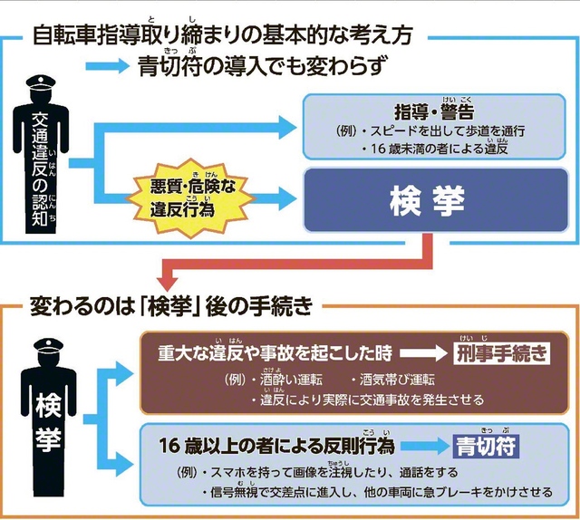 青切符制度が導入されても、自転車に対する交通指導の基本的な考え方は変わりません。警察官が違反を確認した場合でも、直ちに反則金の対象とするのではなく、まずは「指…