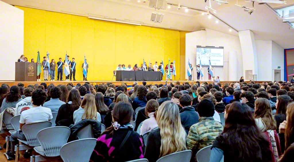 アルゼンチンSGIが各団体と共催した平和集会。20校以上の高校の生徒も参加し、平和の重要性を確認し合った(アルゼンチン平和講堂で)