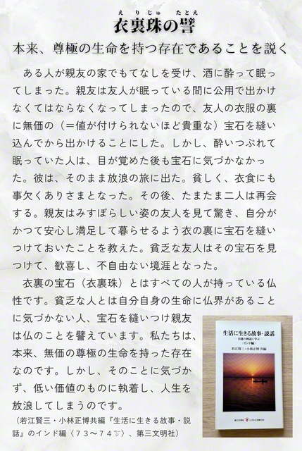 宝石を身につけているのに、当の本人だけがその価値に気づかない――そんな、ちょっと不思議な“すれ違い”が人生にはあります。仏典「衣裏珠のたとえ」をもとに、今回のNEO仏教説話では、自分の中の宝を見失っている人と、それに気づかせようとする友の物語を描きます。