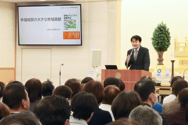 社会学の観点から「団地」「社会的孤立」などについて研究する摂南大学の小池高史准教授が登壇。「幸福城部の大きな地域貢献」とのテーマで、自身の著書『団地コミュニティと創価学会』(第三文明社刊)を通して講演した。