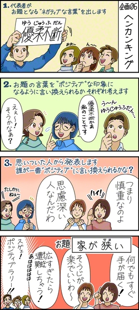 ここでは、座談会で楽しめる“ミニ企画”を提案しています。 今回は「ヘンカンキング」です。 【内容】出題された“ネガティブな印象の強い言葉”を、参加者が“ポ…