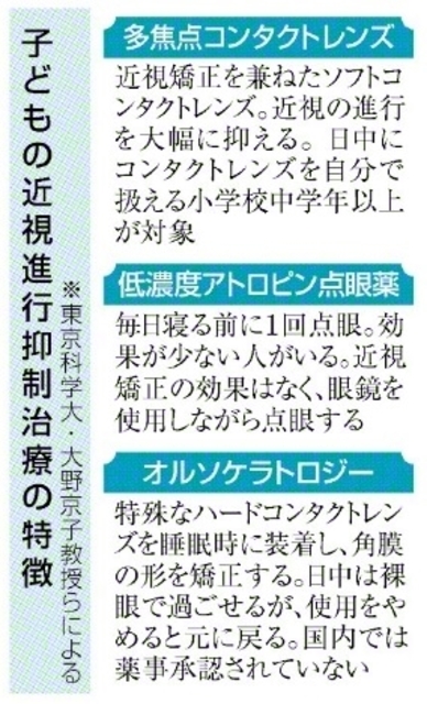 日本近視学会の理事長を務める東京科学大学の大野京子教授(眼科学)は「点眼薬と多焦点コンタクトレンズは近視になり始めた子どもが使うことで、将来的な近視度数をかなり減らすことができる。国内では近視対策が遅れてきたが、新しい治療法の承認は大きな福音となる」と話しています。