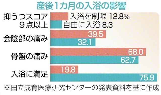 産後1カ月の間に入浴で湯船につかっても感染症は起きない半面、入浴に対する満足度はとても高まったとの研究結果を、国立成育医療研究センター周産期・母性診療センター産科の小川浩平、衣斐凜子両医師らが国際学術誌に発表しました。