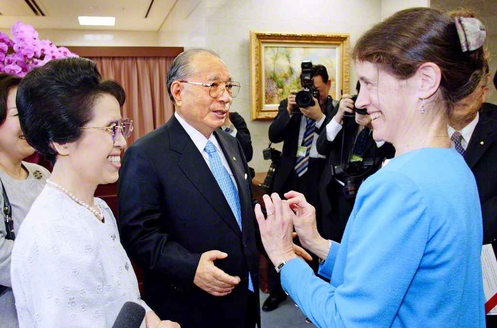 池田先生ご夫妻がワイダー博士を歓迎。博士は「私も平和の建設者として全力を尽くします」と語った(2006年7月、創価大学で)