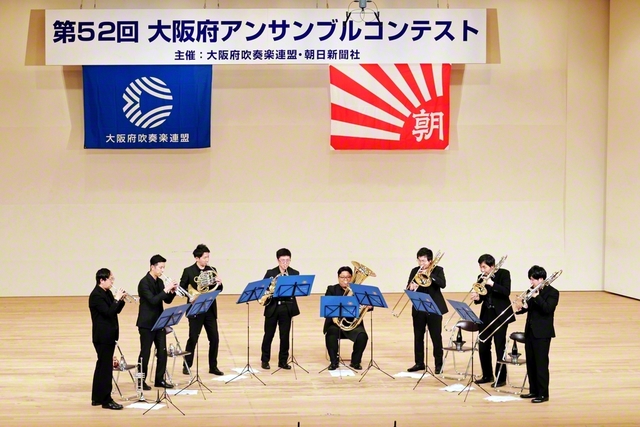 第52回「大阪府アンサンブルコンテスト」(主催=大阪府吹奏楽連盟、朝日新聞社)の「職場・一般の部」が18日、大阪・大東市立総合文化センターで開催され、音楽隊の関西吹奏楽団(岩本敬太楽団長)の金管八重奏が出場した。