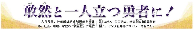 3月5日、壮年部は結成60周年を迎える。社会、地域、家庭の“黄金柱”に最敬礼したい。ここでは、学会創立100周年を担う、ヤング壮年部にスポットを当てた。 明…