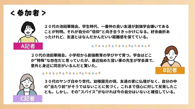 第1回のテーマは「創価学会は中間集団⁉ もしかして中間集団って嫌われてる?」。初回でもあり、3人の記者と富永さんで語り合いました。