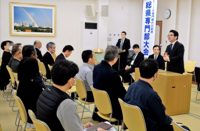 総県専門部大会が7日、近江八幡文化会館で行われた(写真)。 県専門部長の4人に続き、参加者全員が自己紹介。上野誠二さんの活動報告の後、清家総県専門部長は「『…