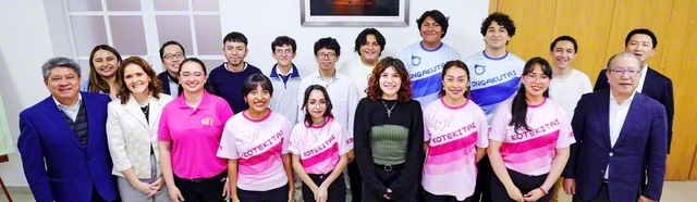【メキシコ市】メキシコ青年部に次代の中核となる新たな人材育成グループが誕生! メキシコ平和文化センターで7日(現地時間)に結成され、メンバーは谷川SGI理事長、西方同青年部長と共に誓いのカメラに納まった(写真)。