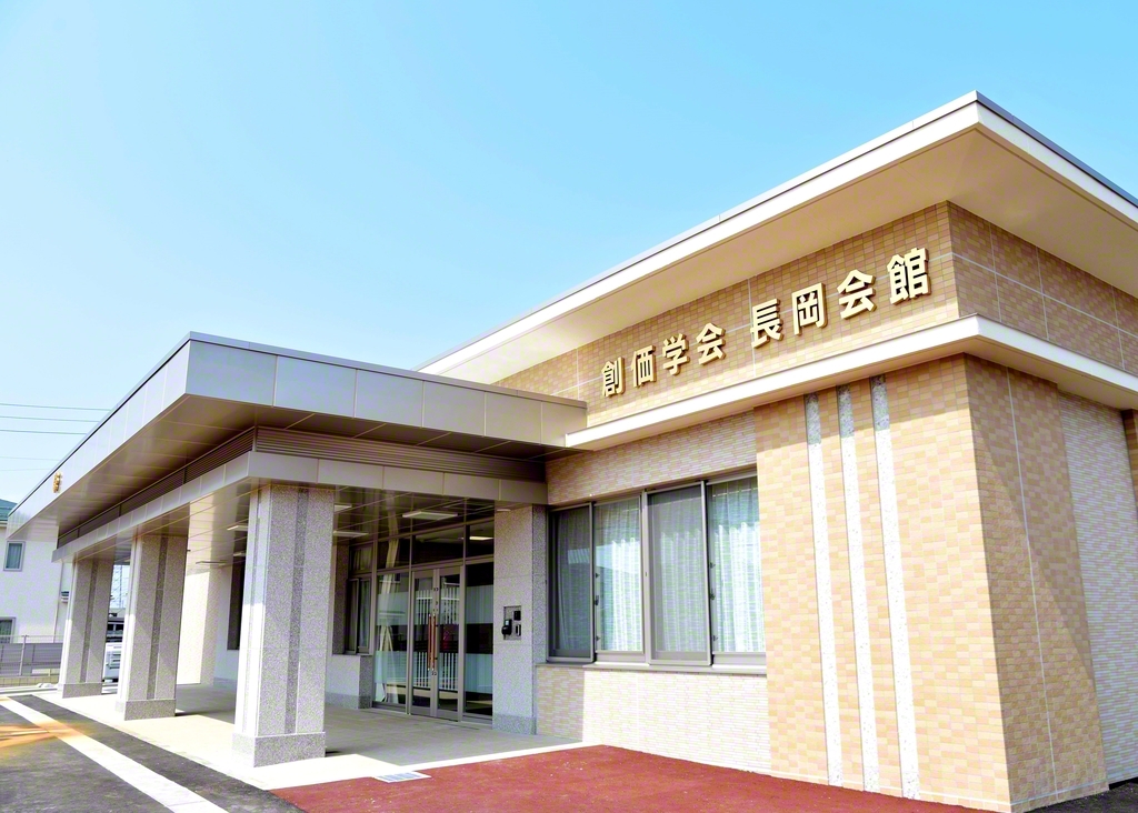 中越圏の中心会館となる新宝城は、鉄筋コンクリート平屋建てで、礼拝室や法話室などを備える。