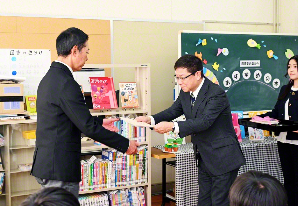 山本浩昭校長は「本を読むことで、さまざまな知識を身に付けることができます。読書を楽しんでほしい」と述べた。児童からは「頂いた本を勉強に生かしていきたいです」との声が寄せられた。