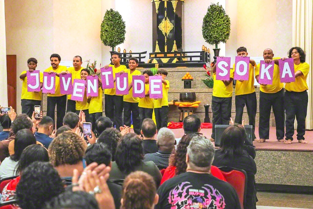 笑顔がはじけたブラジル・リオデジャネイロ青年部・創価ユースの総会(リオデジャネイロ文化会館で)。かつて先生はリオの友に語った。「目的を大きく持って信心に励んだ者が、最後には勝つんだ」と。皆で師弟誓願に生き抜く青春を約し合った