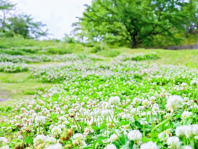 シロツメクサが、風に吹かれて咲き広がっていた。緑の“じゅうたん”に白い小花が輝くように揺れる姿は、けなげで爽やか。(5月10日、橿原市内で撮影)
