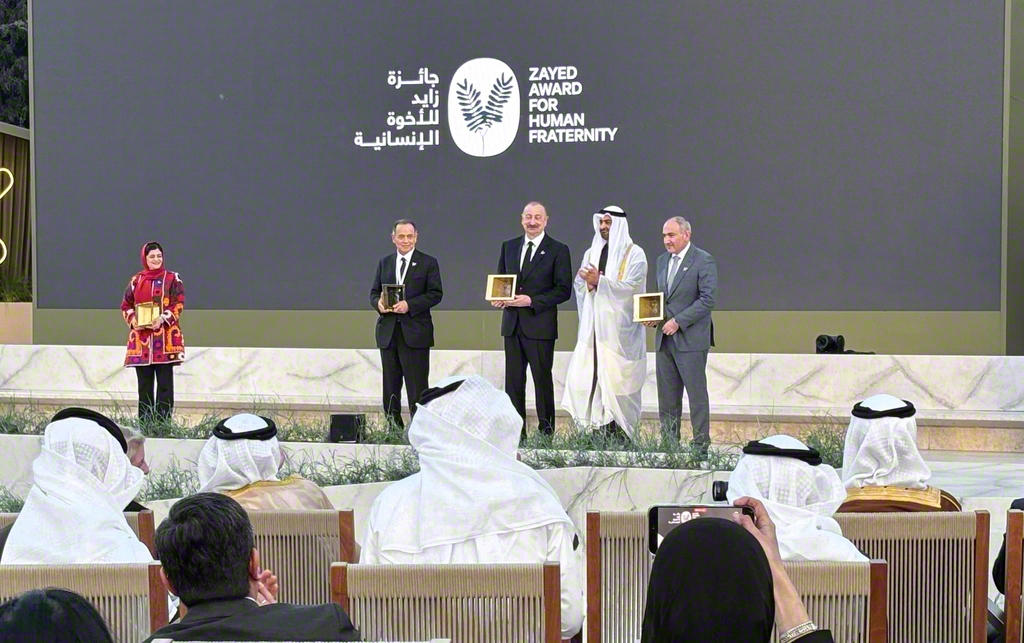 「人類の友愛ザーイド賞」の授賞式。UAEのムハンマド・ビン・ザーイド・アール・ナヒヤーン大統領(右から2人目)から受賞者らに顕彰が行われた(4日、アブダビの創設者記念碑で)