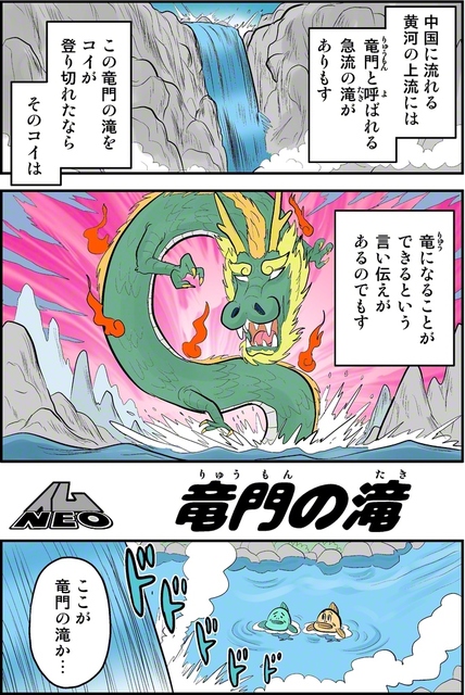 黄河にある急流「竜門の滝」。そこを登りきった魚は、竜になる――そんな中国の伝説がある。挑むのは本来、滝を登るのが得意なコイ……のはずだった。なんと名乗り出たの…