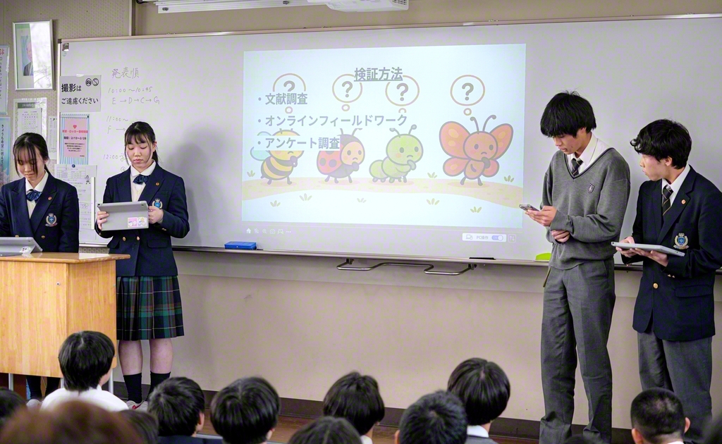 関西創価高校(大阪・交野市)の1、2年生は14日、探究型総合学習の成果を披露した。これは、同校の教育プログラム「GRIT(地球的課題の調査と探究の時間)」の一環によるもの。