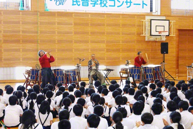 山口の山口市立阿知須小学校では、双子の和楽器ユニット「AUN」と、鳴物師「HIDE」が出演し、和太鼓や三味線、鳴り物を使った迫力満点の演奏で会場を盛り上げた。