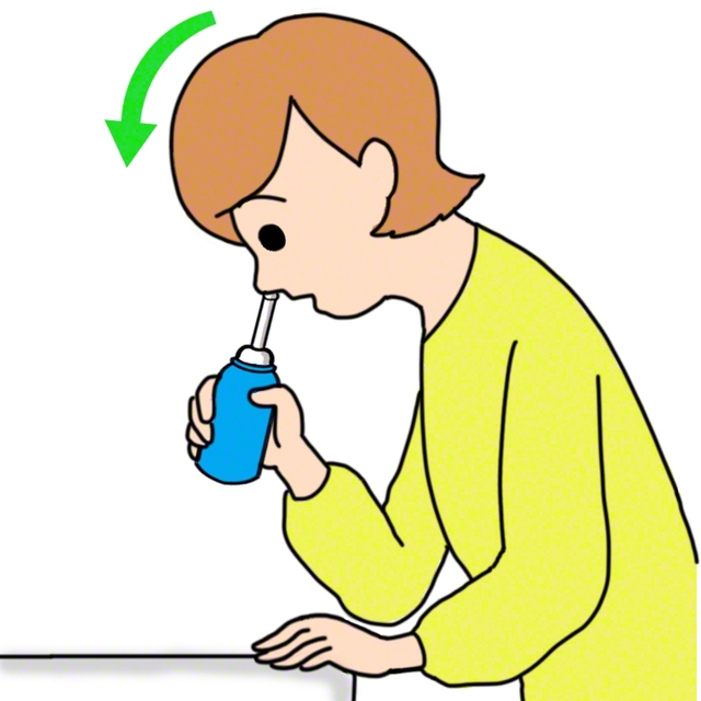 ③ 口で呼吸しながら片方の鼻の穴にノズルを当て、ゆっくりと洗浄液を注入する