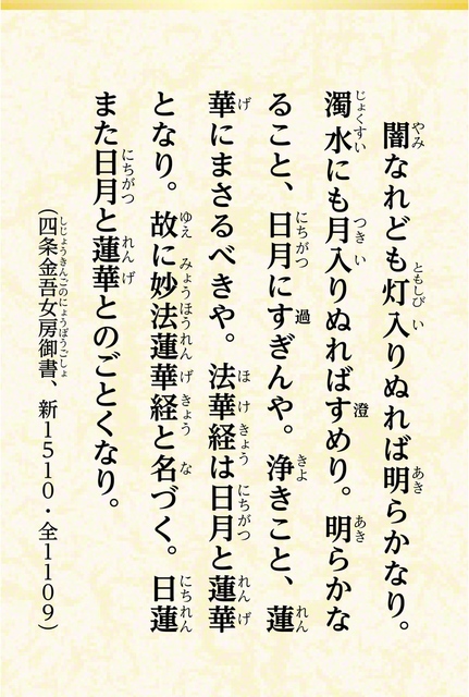 【通解】闇であっても灯をともせば明るくなり、濁った水でも月が映れば澄んで見えるものである。明るいことでは、日月(太陽と月)に過ぎるものがあろうか。浄らかなことでは、蓮華に勝るものがあろうか。法華経は、日月と蓮華のようである。ゆえに、妙法蓮華経と名づけるのである。日蓮もまた、日月と蓮華のようなものである。