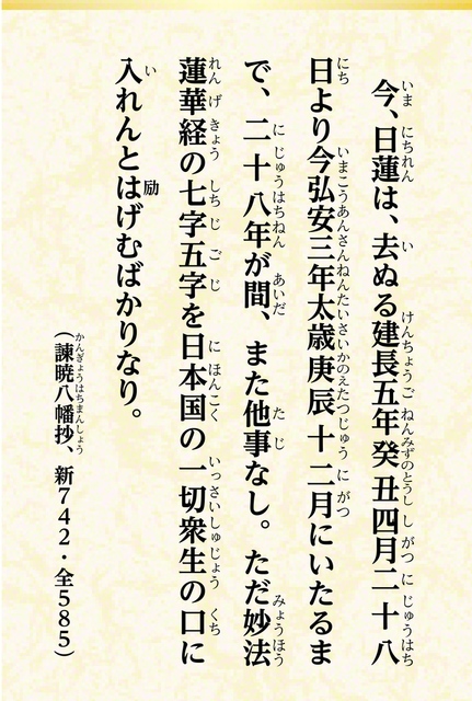 【通解】今、日蓮は、去る建長5年4月28日(の立宗の日)から、(本抄を著した)今年弘安3年12月に至るまで、28年の間、他事は一切ない。