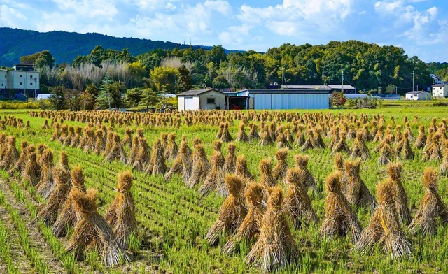 稲刈りが終わった田んぼに、三角に束ねられた稲わらが並ぶ。 刈られた株からは「ひこばえ」と呼ばれる芽が伸び、一面を青く染めていた。(27日、大和郡山市内で撮影…