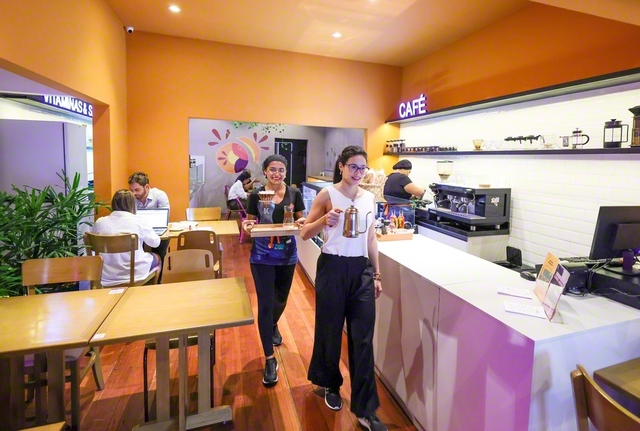 2階はおしゃれなカフェになっていて、出されるコーヒーやお菓子のおいしいこと! 「体にもいいんですよ」と、ステファニさん。学校帰りの児童・生徒も安価で利用できるメニューあり、子育て世代も過ごしやすいスペースあり。子どもや親御さんたちが、ホッとできる居場所だ。