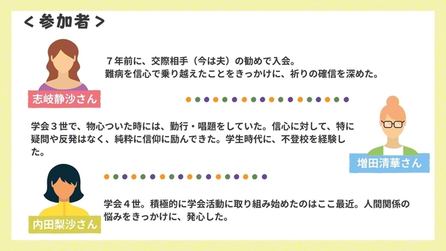 志岐さんや増田さんも、他のメンバーの祈りに支えられた経験がある。志岐さんは、自身の友人が対話の末に入会に至った際、入会するまでの間、地域の同志が友人の幸福を祈ってくれている姿を目の当たりにした。そして“自分が入会した時もこうして自分の幸せを祈ってもらっていたんだ!”と感謝が湧いた。「温かく迎えてもらったと感じていたんですけど、それは、皆さんが本当に祈ってくれていたんだなと実感できて、私も恩を返していこうと思いました」と話した。