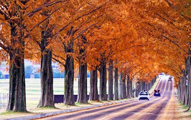 高島市マキノ町のメタセコイア並木が紅葉を迎えた。約2・4キロにわたって約500本のメタセコイアが、道の両脇に植えられている。訪れた観光客は、写真を撮ったり、…