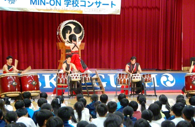【埼玉】民音主催の「学校コンサート」が12日、埼玉・東松山市の高坂小学校で開催され、和太鼓グループ「舞太鼓あすか組」が出演した(写真)。 迫力ある演奏の数々…
