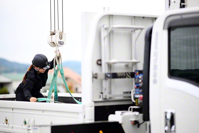 大型トラックやダンプカーなどでの重量物の輸送をはじめ、ユニック車(クレーン付きトラック)を使用した建設機器の輸送、機動力のある軽配送、介護タクシーまでと、請け負う仕事は幅広い。