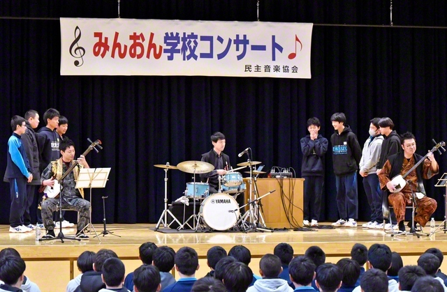民音主催の「学校コンサート」が20日、大船渡市立東朋中学校で開催された(写真)。 津軽三味線奏者の葛西頼之氏、相澤裕斗氏とドラマーの大河内新太氏が共演。和と…