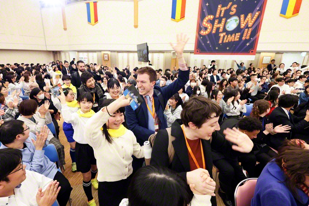 日米青年平和総会では、アメリカ青年部の友が「エスコートキッズ」(少年少女部員)と手を取り合って入場。拍手と歓声が鳴り響き、総会の幕が開いた。
