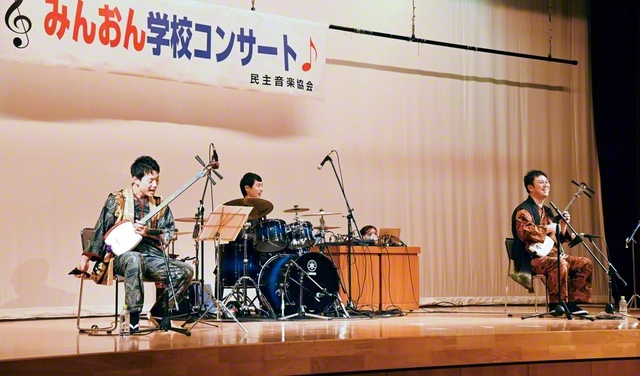 民音主催の「学校コンサート」が27日、山形の鮭川村農村交流センターで行われ、鮭川小学校の児童、鮭川中学校の生徒らが鑑賞した(写真)。津軽三味線奏者の葛西頼之氏…