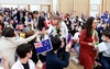 東京・城北池田記念講堂の交歓会で、アフリカの友がパフォーマンス。茶道体験も行われ、北総区の代表が真心のお茶を振る舞った
