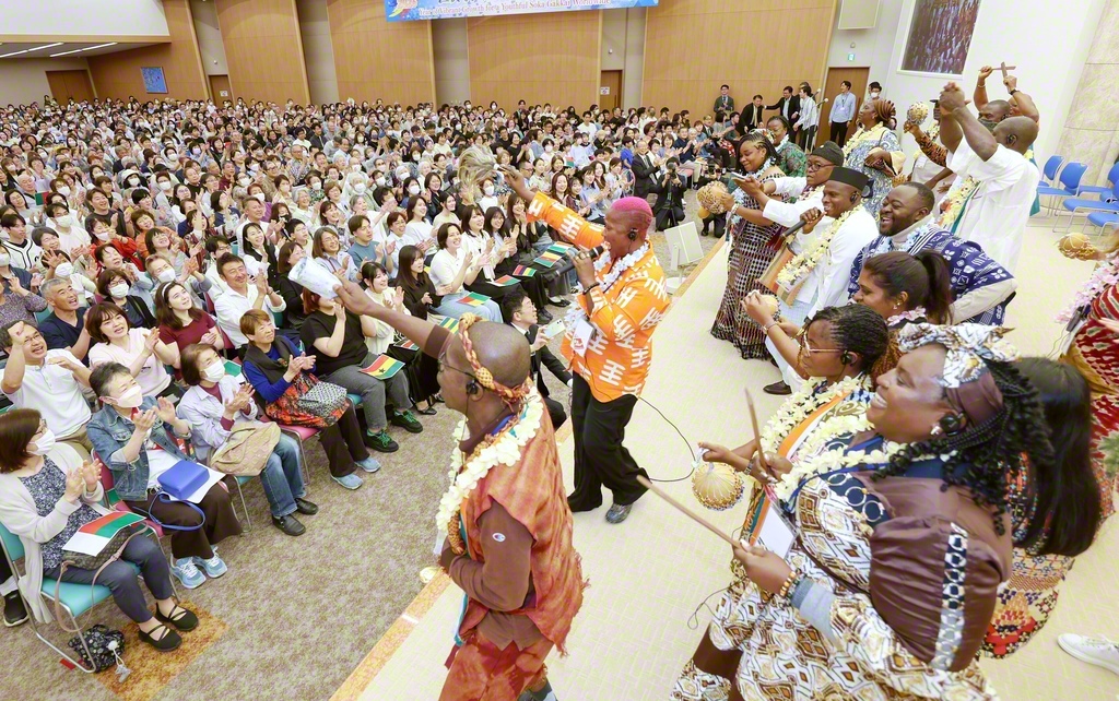 カメルーンのアン・スエさんは、信心で境涯革命し、地域貢献の取り組みで国家から勲章を受けた喜びを語った。アフリカの友のパフォーマンスには、日本の同志も輪に加わり、創価の絆が輝いた。
