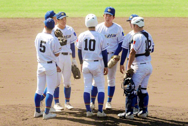 関西創価は六回裏、1死満塁のピンチを迎え、内野陣がマウンドへ。その後、団結した守備力を発揮して後続を断つなど、最後まで負けじ魂のプレーが光った。