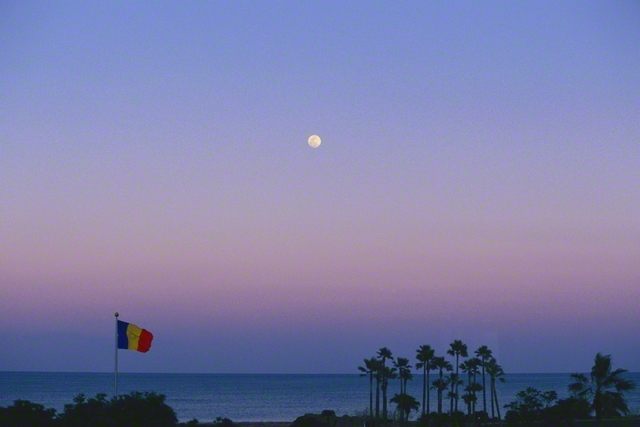 【写真説明】太平洋の彼方、薄紅の夕空に十四夜の月が昇った。たなびく三色旗。さながら眼で詠んだ詩のような一葉である。1999年3月、池田大作先生が宮崎研修道場で…