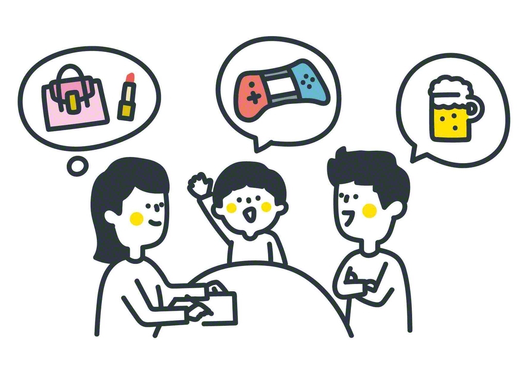 お母さんやお父さんが子どものお小遣いを取り上げておいしいご飯を食べていたら、子どもたちは怒っちゃいますよね。家族全員で話し合って、「みんなが必要なもの」を決めるのが、一番納得のいくやりかたです。
