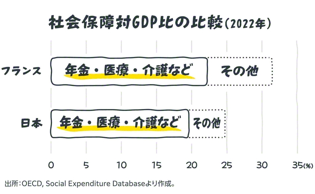 でもちょっと待ってください! 高齢化率、つまり、お年寄りの割合が増えていけば、年金・医療・介護は自動的に増えます。高齢化率は日本で30%、フランスで22%ですから、本当は日本の年金・医療・介護のほうが手厚くていいはず。それなのに、フランスのほうが明らかに充実しているのです。
