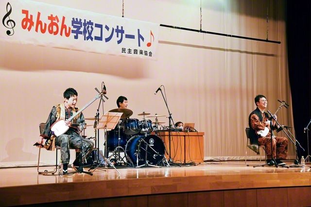 民音主催の「学校コンサート」が27日、山形の鮭川村農村交流センターで行われ、鮭川小学校の児童、鮭川中学校の生徒らが鑑賞した。津軽三味線奏者の葛西頼之氏、相澤…