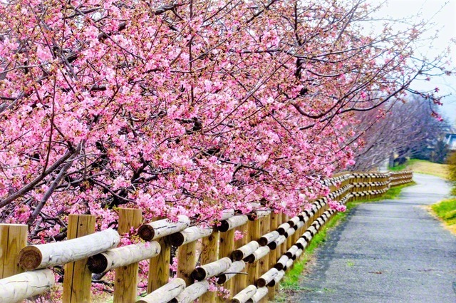 明日香村から川西町へ流れる飛鳥川。橿原市内の川沿いで、早咲きのカワヅザクラが見頃を迎えていた。3月を前に、春の気配が一層強く、鮮やかに。(24日に撮影)