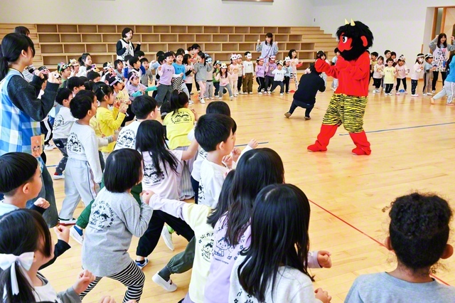 園児は自作の“鬼のお面”をつけ、楽しいひとときを過ごした。坂本園長は「心の中の“悪い鬼”に負けずに、のびのびとした強い心を育んでいこう」と語った。