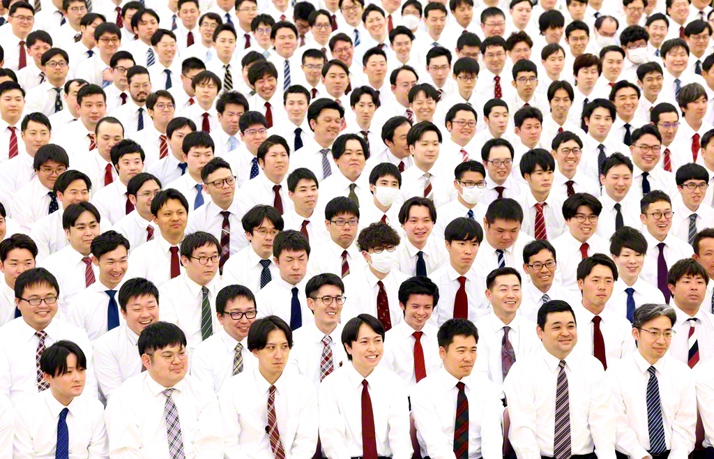 学会厳護の誇りを胸に対話拡大に駆ける創価班の友。集いでは、「創価班歌」を歌い上げた(15日、東京戸田記念講堂で)