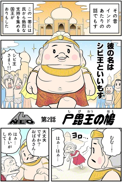 「NEO仏教説話」の第2回は、古代インドの王様が鳩と鷹のあいだでまさかの大ピンチ――!? 鳩をかばったはずが、なぜか“お肉問題”に発展し、ついには王様自身がバ…