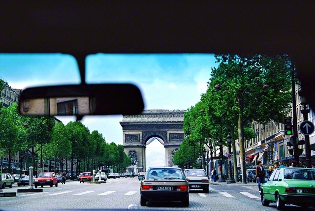 にぎわうフランス・パリのシャンゼリゼ通り。緑の街路樹の向こうに凱旋門がそびえる。1987年6月、池田大作先生が車中からカメラに収めた。 池田先生はこの訪問の…