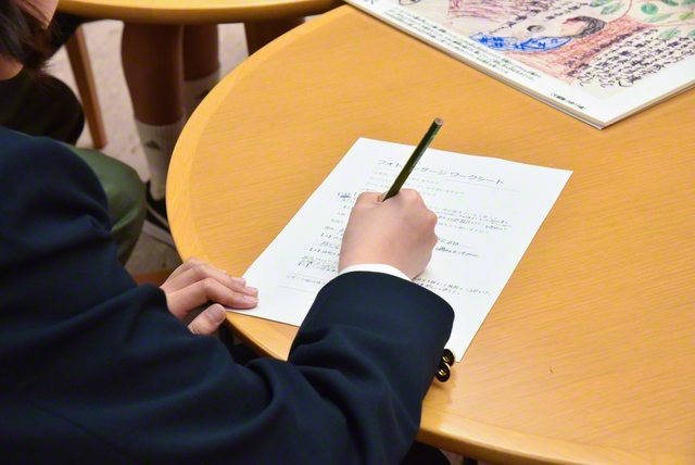 ――ワークシートの問い③④について語らいを重ねます。「考えていたよりも悲しい出来事だった……」「赤ちゃんはこの後、生きていけたのかな」「(梅さんは)つらい経験を思い出して、描いてくれたんだと思う」「戦争は恐ろしい。ろくなことがない」