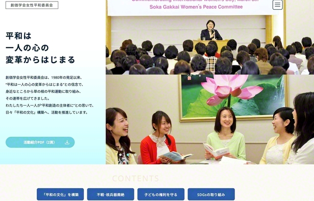 女性平和委員会の活動を紹介する学会公式サイトの特設ページ。「平和の文化」の構築、不戦・核兵器廃絶、子どもの権利の啓発、持続可能な開発目標推進など各分野の取り組…