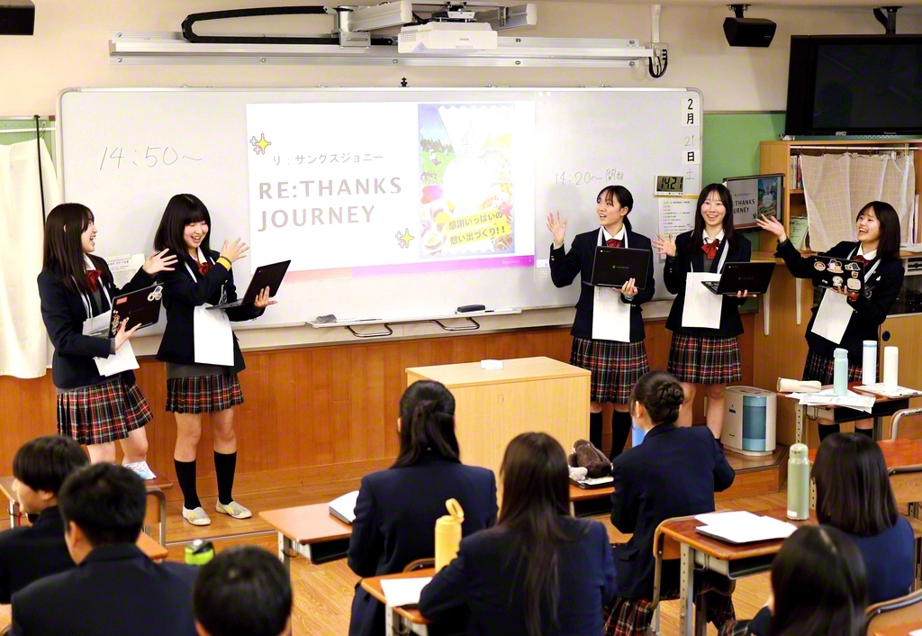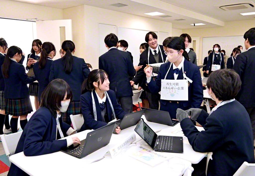 1年生は、中学生以下のSNS利用などを題材に、問題提起から結論に至るまでの過程をポスターに整理して発表。2年生は沖縄研修に向け、「SDGsと平和学習」をテーマに研究した内容を報告した。3年生は、企業から提示された課題に対し、新商品や新ブランドを検討。企業理念に即した具体的な提案を行った。
