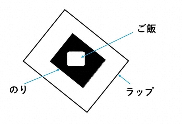 ❺ のりを四方から折り畳み、ラップで全体をくるむ。2個作る。